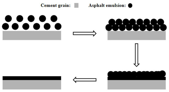 Process of emulsified asphalt demulsification and film formation on the surface of cement particles.