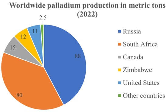 Platinum group metals (PGMs), a family of rare and valuable elements, play a pivotal role in a multitude of industries due to their exceptional properties. The collective demand for these metals is steadily escalating, driven by their indispensable contribution to modern technologies and emerging sustainable solutions. Among the PGMs, palladium stands as a prominent member, revered for its diverse range of applications that span across electronics [1], pharmaceuticals [2], and jewelry [3]. However, its most notable applications lie in its role in environmental preservation, such as catalytic converters that mitigate harmful emissions in the automotive sector [4] and as a catalyst for renewable energy production [5]. The extensive release of greenhouse gases leads to global warming, posing a significant challenge for environmental sustainability, a major concern for mankind today [6]. The imperative for a transition to green energy highlights the growing interest in clean, renewable energy from both industrial and academic standpoints [7]. Palladium and its alloys are recognized for their excellence in hydrogen production membranes, owing to their superior selectivity and permeation rate in comparison to other inorganic metallic membranes [8]. The role of palladium in preserving the environment is not limited to hydrogen production, as the researchers have succeeded in developing a Pd-catalyzed reaction for the efficient synthesis of fine chemicals under environmentally friendly conditions [9]. As industries continue to harness the unique attributes of palladium, the imperative to ensure its sustainable supply and utilization becomes increasingly pressing. However, securing a steady supply is not a simple task, as worldwide palladium production is nearly monopolized by Russia and South Africa [10]. Other countries that have a major contribution to the worldwide palladium production are Canada, Zimbabwe, and the United States. Detailed information about the amount of palladium produced in 2022 is shown in Figure 1.
