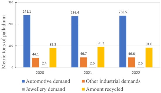 The recovery of PGMs from primary ores faces challenges, such as low PGMs content, high energy consumption, and limited concentration recovery. Conversely, secondary resources boast significantly higher PGM concentrations, which makes them highly preferable for exploitation, while simultaneously curbing the need for extensive ore mining. Secondary sources demand significantly less energy consumption, attain superior recovery yields, and bear a diminished environmental footprint [66]. It might be assumed that the recycled materials for palladium recovery would exhibit significant variability. However, there is one main type of material that stands out. To explain this, we present data regarding the palladium demand across various sectors, and how much palladium was recycled from 2020 to 2022 (shown in Figure 3).