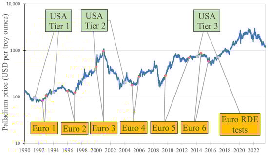 Figure 4. Changes in the price of palladium in the context of emission legislation.