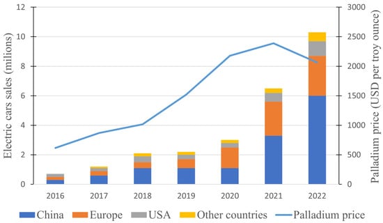Figure 5. Yearly sales of electric cars and yearly average prices of palladium spanning from 2016 to 2022.