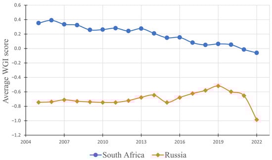 Figure 6. Yearly average WGI scores of South Africa and Russia, spanning from 2005 to 2022, based on [106].