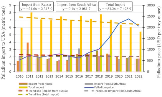 Figure 7. Yearly average values of palladium imports to the USA and yearly average prices of palladium spanning from 2010 to 2022.