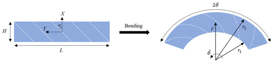 Regarding Figure 2, the term defines the ultimate bending angle of the bar. As shown in Figure 2, the main directions X and Y are oriented in the direction of the thickness and length of the bar, respectively, which have a 90 degrees counter-clockwise rotation when compared to the main directions in Figure 1. Since the deformations generated in fiber-reinforced anisotropic materials are of a similar type, it is possible to assume that the entire structure of the anisotropic rectangular material will exhibit a deformation field as follows [26,40]: