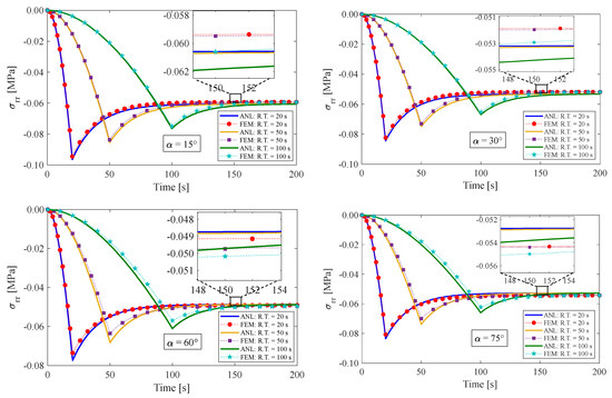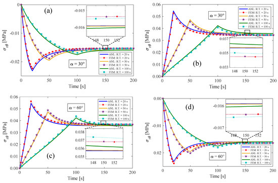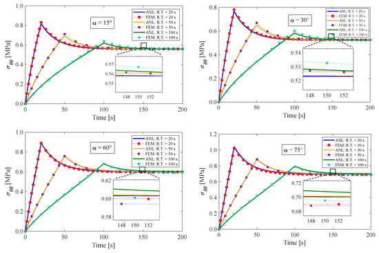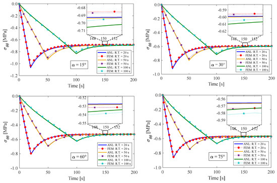 This section presents the response of the fiber-reinforced visco-hyperelastic model to a finite bending relaxation test under various conditions. The fibers are embedded into the rectangular matrix material with different initial angles. Initially, the anisotropic rectangular material is bent until it reaches a maximum bending angle (B.A.) of 180° with three different rising times (R.T.) of 20 s, 50 s, and 100 s, and then, the bending angle is kept fixed for a period of time. Figure 4 and Figure 5 depict the changes in tangential stress in the outer and inner surfaces of the material, respectively. It can be observed that the stress components rise up to their maximum values during the rising time and then gradually decrease until they reach equilibrium values. Figure 4 shows that the outer radius experiences tensile stress due to tensile loads applied. On the other hand, as expected, the tangential stress at the inner radius of the bent bar is compressive (see Figure 5). As mentioned earlier, the material is reinforced by a family of fibers with the same initial angle of . It can be noted that by increasing the fiber angle from to , the magnitude of the stress components decreases; however, by further increasing the fiber angle up to , the value of the stress components increases. It could be said that this point is the result of a change in the tensile strength of the material for different fiber angles. As mentioned, the presence of fibers in the matrix material with angles between 0° and 90° causes shear stresses under bending, which leads to a small error in the response of the material. We can point out as a limitation of the presented approach that choosing fibers from softer materials compared to the matrix can reduce the model error. Table 2 displays the error percentage between the analytical and numerical results for different fiber angles. The meaning of error in this part can be summed up as the biggest difference between the obtained analytical and numerical answers. Based on these findings, it can be concluded that the analytical approach proposed in this paper can effectively predict the mechanical response of anisotropic materials under finite bending deformations.