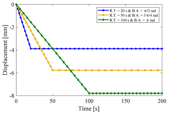 Figure 6 represents the variation of radial stress along the neutral axis of the bent bar for different fiber angles. It is important to note that the inner and outer surfaces of the bent bar have zero radial stress, while the maximum value is observed on the neutral axis. The neutral axis refers to a longitudinal axis in the middle section of the bar, where there is no stretch during bending. The findings from Figure 6 indicate that the radial stresses on the bent bar are compressive. Due to the incompressibility of the fiber-reinforced material, the neutral axis has a displacement toward the inner surface through bending deformation. Figure 7 illustrates the magnitude of displacement of the neutral axis for the ultimate bending angles of 90°, 135°, and 180° at different arbitrary rising times.