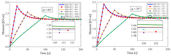 Additionally, the impact of the fiber angle on the resultant bending moment is displayed in Figure 9. It has been observed that the maximum value of the moment rises with decreasing deformation rates. Based on the data presented in Figure 9, it is evident that the relaxed resultant bending moments maintain a consistent value at the ultimate bending angle, regardless of the rising time. These findings align with our expectations based on Equation (33), indicating that the resultant bending moment follows a similar trend as the tensile tangential stress.