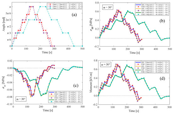(a) Inputs of multi-step relaxation test, (b) tangential and (c) radial stress components, and (d) resultant bending moment for the fiber angle of .