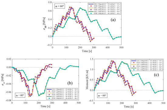 (a) Tangential and (b) radial stress components, and (c) resultant bending moment for the fiber angle of .