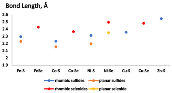 For all M2X2(CO)4 complexes, which have two conformations (planar and non-planar), the M-X bond lengths in the planar core are shorter than in the non-planar rhombic core, as shown in Figure 2. The Fe-S and Co-S bond lengths variation is much smaller as compared to the Ni-S or Ni-Se bond lengths difference. For M2X2(CO)4 complexes studied, the Co-S/Se bond length is the shortest one and this result corresponds to the strong Co-S bond found in the diatomic molecule [45]. For the global minimum structures of M2X2(CO)4, the bond lengths increase as follows: Co-S < Fe-S < Ni-S < Cu-S < Co-Se < Fe-Se < Cu-Se < Ni-Se < Zn-S. While zinc sulfide exists in the solid state and forms clusters without ligands, the filled 3d shell does not allow interaction with a strong electron donor as the carbonyl groups. The Zn-CO bonds reach 2.183 Å, while in the other complexes, they do not exceed 1.95 Å. The Zn-S bonds are also lengthened to 2.541 Å. Thus, Zn2S2(CO)4 is not examined further in the present study.