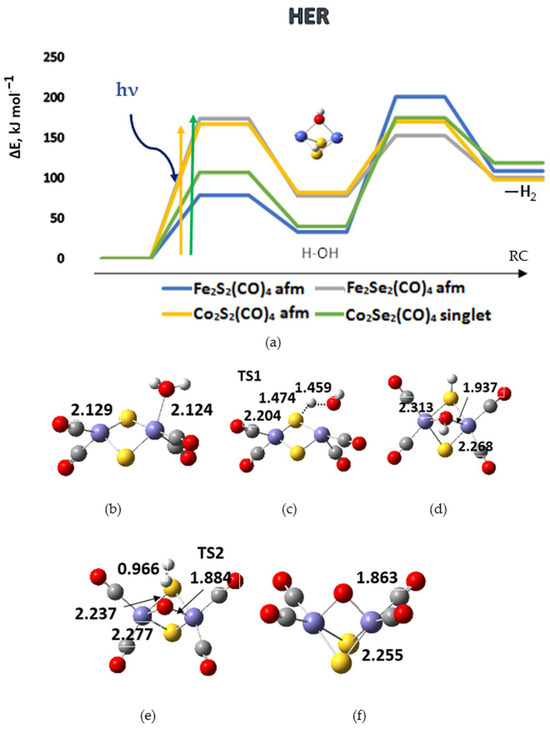 (a) The reaction path of water dissociation and hydrogen evolution (HER) on different tetracarbonyl complexes of iron and cobalt. TS1 corresponds to the reaction barrier of primary dissociation, and TS2 to dihydrogen formation. afm denotes antiferromagnetic singlet ground states. ΔE is the energy difference relative to the ground state complexes; RC—reaction coordinate. The excitation energies of representative most intense singlet-singlet transitions induced by light absorption are denoted by vertical arrows. (b) Structure of the water adsorption complex on Fe2S2(CO)4; (c) structure of TS1; (d) dissociated water on Fe2S2(CO)4; (e) structure of TS2; (f) structure of the product with bridging oxygen after hydrogen desorption. Cartesian coordinates of intermediate species are presented in Supporting Information.