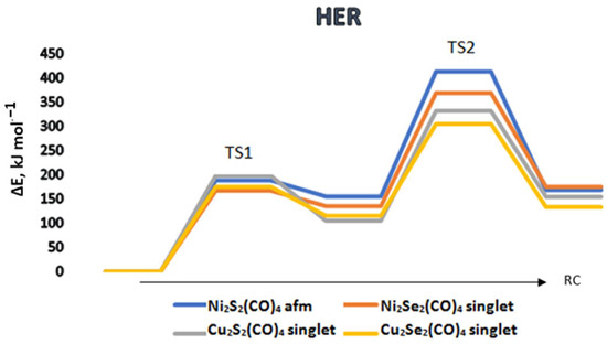 The reaction path of water dissociation and hydrogen evolution (HER) on different tetracarbonyl complexes of nickel and copper. TS1 corresponds to the reaction barrier of primary dissociation, and TS2 to dihydrogen formation. afm denotes antiferromagnetic singlet ground states. ΔE is the energy difference relative to the ground state complexes; RC—reaction coordinate.