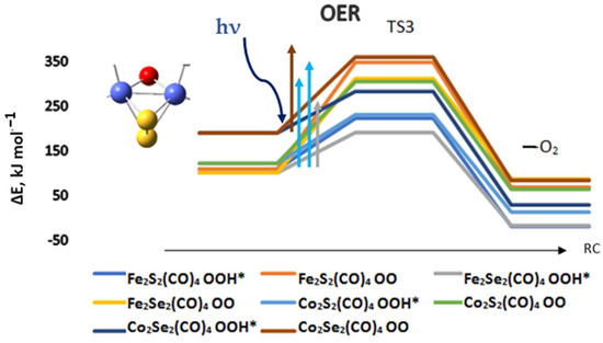 Previous studies outlined the role of pH and oxygenated reaction intermediates after proton–electron removal [4,5,6,7,8,53,54,55]. The oxygen evolution reaction on the chalcogenide complexes also proved to be pH dependent and in acidic media it proceeds via protonation and a peroxo intermediate OOH*, which is the more favorable route, Equation (2). Here again, the lowest energy barriers of 91 and 93 kJ mol−1 are obtained for the selenide complexes, Fe2Se2(CO)4, and Co2Se2(CO)4, followed by the disulfides of iron and cobalt, Fe2S2(CO)4 and Co2S2(CO)4 with barriers of 114 and 109 kJ mol−1, as shown in Figure 6. The OER reaction begins with an oxygen-bridged complex, which comes out from the HER reaction.