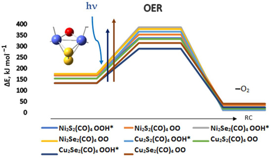 The reaction path of oxygen formation and oxygen evolution for nickel and copper chalcogenide complexes. ΔE is the energy difference relative to the ground state complexes; RC—reaction coordinate. The global minima complexes were used, as denoted in Figure 5. The excitation energies of representative most intense transitions induced by light absorption are denoted by vertical arrows.
