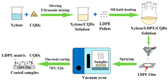Coating Preparation: The schematic diagram of composite coating preparation is shown in Figure 1. Polyethylene was selected as the matrix and CQDs as fillers for the preparation of composite coatings. The desired mass fraction of CQD powder was added to 50 mL of xylene solvent, stirred, and ultrasonically dispersed for 1 h to form a mixed solution. Afterwards, the mixed solution was poured into a round-bottomed flask, and 1 g of polyethylene particles was added and dissolved by magnetic stirring at 120 °C until completely mixed. The solution was then sprayed onto the polyethylene film, carefully controlling the gun pressure (45 psi), spraying distance (200 mm), and spraying time. Finally, the sprayed samples were cured in an oven at 70 °C for 12 h. The mass fractions of nanofiller to polymer matrix were 0.1 wt%, 0.2 wt%, 0.3 wt%, 0.5 wt% and 0.7 wt%, respectively. The spraying time was also adjusted to 4 s, 6 s, 8 s, 12 s, and 16 s. The different coatings were expressed as “CQDs-mass fraction-spraying time”. For example, CQDs-0.3-8 s is a coating filled with 0.3 wt% CQDs filler sprayed for 8 s.