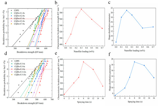 DC breakdown characteristics of different coated samples. Weibull distribution plot of DC breakdown strength (a), characteristic breakdown strength (b), and shape distribution parameters (c) of coated samples doped with varying concentrations of CQDs; Weibull distribution plot of DC breakdown strength (d), characteristic breakdown strength (e), and shape distribution parameters (f) of coated samples prepared with varying spraying durations.