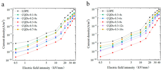 Figure 4 compares the electrical conductivity of the coated samples with pristine LDPE. Specifically, the current density—electric field (J–E) characteristic curves of LDPE and composite coatings, doped with varying concentrations of CQDs, are represented in Figure 4a. As illustrated in Figure 4a, a pronounced alteration in the slope of the J–E curves is observed with the increase of the electric field. This behavior aligns with the phenomenon associated with the space charge-limiting current exhibited by solid dielectrics [40]. For LDPE, the conductivity current reveals two distinct gradients with a turning point of 10 kV/mm. Specifically, the J–E curve exhibits a relatively modest slope when the field strength lies below 10 kV/mm, indicating a small alteration in current density in response to the field strength. However, at 10 kV/mm, a pivotal transition in the conductivity current occurs, whereby the curve assumes a steeper slope. The conductivity current of the coated samples exhibits a lower magnitude in comparison to that of LDPE, displaying a trend of initial decline followed by subsequent escalation in response to the CQD doping concentration. Remarkably, the coated samples exhibit a turning electric field in the range of 10–15 kV/mm, which consistently exceed the turning field strength observed in LDPE. Notably, at a doping concentration of 0.3 wt%, the current density attains its minimum value among all specimens, and the turning field strength reaches approximately 15 kV/mm, surpassing the corresponding value of LDPE. In line with the theory of space charge-limiting current, the magnitude of the transitional electric field corresponds to the alteration in the conductivity mechanism. When the electric field is above the transition point, the formation of space charge begins to limit the change in current.