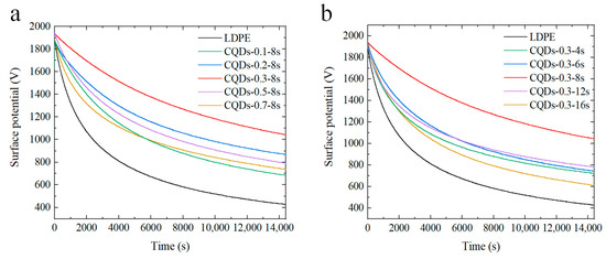 (a) Isothermal surface potential decay characteristics of coated samples doped with varying concentrations of CQDs; (b) isothermal surface potential decay characteristics of coated samples prepared with varying spraying durations.