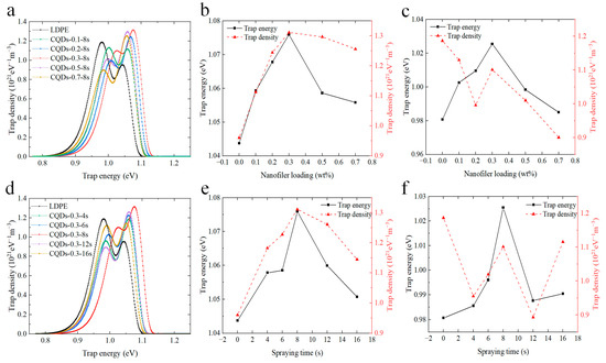 Figure 6e,f illustrates the trap distribution of coated samples with different spraying durations. The results indicate that the deep and shallow trap energy levels of coated samples exhibit higher values compared to LDPE. Furthermore, the increase in spraying time initially leads to an increase in the deep trap energy level and density, followed by a subsequent decline. Remarkably, the maximum deep trap energy level and density are achieved for the sample with a spraying time of 8 s. Simultaneously, the shallow trap energy level also exhibits a preliminary rise followed by a subsequent decline, although the correspondence between shallow trap density and spraying time is not particularly prominent. This suggests that spraying at the proper time helps to increase the trap energy level and deep trap density of the coated samples.