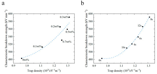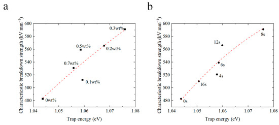 The deep traps introduced in the coated samples are caused by the different electronic energy band structures of the doped filler and the polymer matrix [45,46]. CQDs, as a semiconducting material, have a narrower energy band gap, which is capable of trapping free carriers through strong electrostatic attraction [47]. The electron trap depth is the energy difference between the LUMO levels of the pristine and doped polymers [48]. When the doping concentration is low, the large energy level difference leads to the introduction of deep traps in the band gap of LDPE due to the fact that the band gap of CQDs is about 3.2 eV while the band gap of LDPE is about 8 eV [49,50,51]. The charge injected from the electrode is captured by these deep traps, which reduces the charge injection and the carrier mobility and enhances the breakdown strength. When too many CQDs are introduced, the overlap of the interfacial region between the polymer and the filler reduces the energy level of the traps, which leads to a reduction in the breakdown strength.