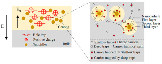 A schematic diagram of the mechanism by which the interfacial composite coating modifies the insulating properties is given in Figure 9. The CQD nanoparticles in the coating sprayed at the surface of the film will form charge deep traps at the interface between the nanoparticles and the polymer matrix. According to the multi-core model proposed by Tanaka, the interface between the nanoparticles and the polymer matrix can be divided into a bonded layer (first layer), a bound layer (second layer), and a loose layer (third layer), and the deep traps are heavily distributed in the first and second layers, while the shallow traps are mainly distributed in the third layer [53,54]. Therefore, the introduction of interfacial composite coatings introduces deep traps between the electrode and polymer interfaces. At relatively low content of nanoparticles, the interfacial region between nanofiller and matrix is almost independent, so the charge injected from the electrodes is easily captured by the deep traps in the bonded and bound layers, which creates a reverse electric field (Eq) and inhibits the charge injection [55,56]. In addition, a large amount of charge is trapped during transport, leading to a decrease in carrier mobility, so that very little charge reaches the interior of the polymer, inhibiting space charge accumulation. As a result, deep traps lead to a concurrent decline in carrier concentration, subsequently diminishing the conductivity of the composite coating. And when the concentration of nanoparticles is high (above 0.3 wt%), the interfacial regions around neighboring particles overlap, leading to the expansion of the loose layer (transition region), which reduces the energy level and density of deep traps within the composite coating. And thus, carriers are easy to detrap from the traps, and the conductivity increases and the breakdown strength decreases. Figure 10 shows the simulation results of space charge distribution and electric field distribution at different trap energy parameters after the introduction of the interfacial composite coating. As can be seen, as the depth and density of the deep traps increase, more charges injected from the electrode are trapped and accumulated near the electrode, resulting in a lower charge migrating into the interior of the polymer medium and a lower degree of electric field distortion. For these reasons, the insulating performances, including breakdown strength and electrical conductivity, are effectively improved.