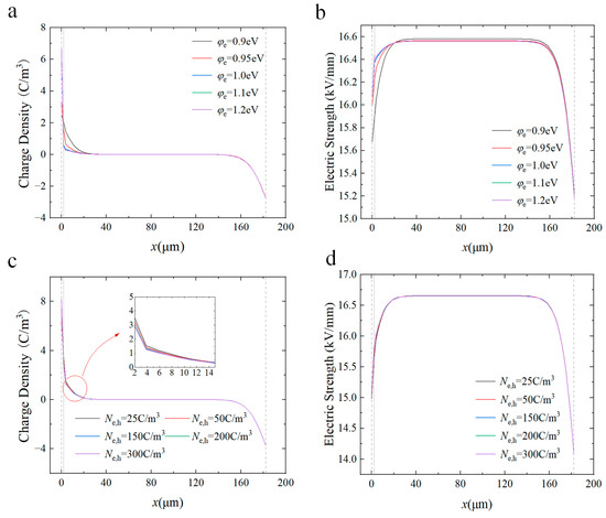The influence of trap parameters on the distribution of space charge and electric field. Simulation results of space charge distribution (a) and electric field distribution (b) in coated samples for trap depths varying from 0.9 to 1.20 eV. Simulation of space charge distribution (c) and electric field distribution (d) in coated samples for trap density varying from 25 C/m3 to 300 C/m3.