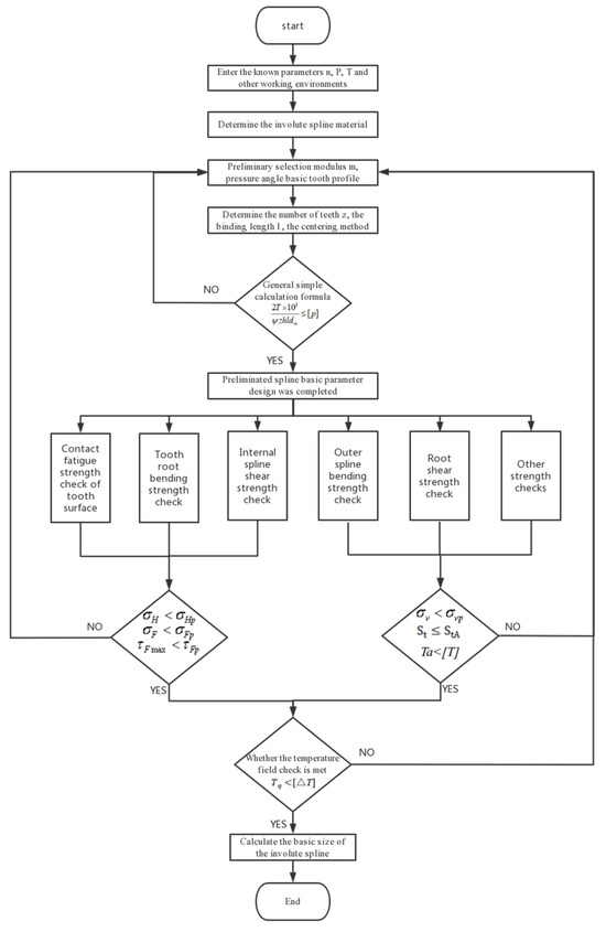 In order to design an involute spline made of PEEK (polyetheretherketone)-based material with better performance and improve the design rules of involute splines, initially, an involute splines design theory for PEEK (polyetheretherketone)-based materials is presented, which combines international standards (ISO 4156, 1. 2. 3, 2005), American standards (ANSI B92.2M. 1989), and traditional empirical formulas. Second, using the involute splines calibration method in international standards as a guide, we developed the involute splines calibration method for PEEK-based materials by estimating the impact of energy consumption caused by viscoelasticity on temperature field calibration. Next, the contact characteristics of the designed spline were analyzed using ABAQUS2022 software to confirm the accuracy and reliability of the design and calibration methods. Finally, finite element simulation was used to analyze the influence of different pressure angles, moduli, combined lengths, and other parameters on the contact characteristics of the spline in order to realize the optimal design of PEEK-based material involute splines, to offer a theoretical foundation and improved design methodology for cylindrical straight-tooth involute splines.