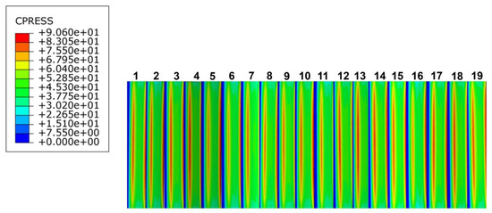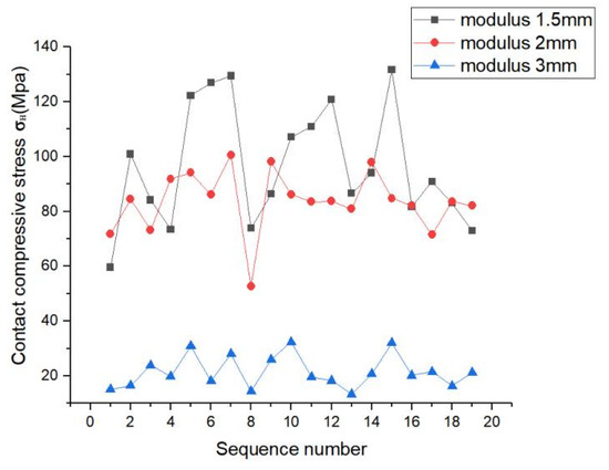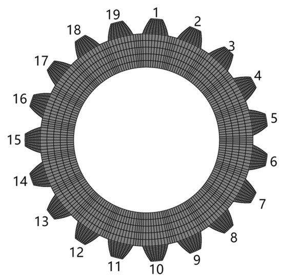 We considered PEEK5600CF30 material involute splines as an example and simulated the actual working conditions and designed the involute splines according to the design steps proposed herein. The input power and speed were p = 1100 (KW) and n = 6000 (rpm), respectively. Material PEEK5600CF30 was selected, and its related mechanical properties and indicators are presented in Appendix B. After strength checks, if the calculated number of teeth did not satisfy the strength requirements, the number of teeth was increased accordingly. More teeth in the American standard implied better quality; the number of teeth increased in the range of 8–65 (8, 10, 11, 12, in increments of 2, up to 65). The preliminary calculations of the basic dimensions of the PEEK-based involute splines are presented in Table 1.