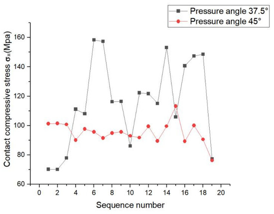 At a known input torque T and modulus m, the number of teeth z was calculated using Equation (6). For example, for 30° circular root, the number of teeth of the spline at αD = 30° was: