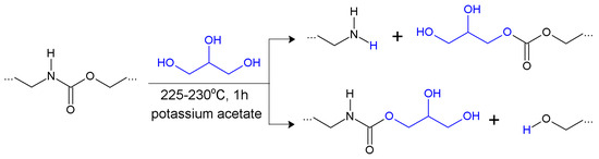 The glycerolysate, used in this study as a modifier, was obtained by glycerolysis of cast poly(ester-urethane) using glycerol and potassium acetate (CH3COOK) as a catalyst. The ratio by mass of cast polyurethane to glycerol was equal to 4:1. The polyurethane was cut into small pieces and dosed in small portions for 1 h in glycerol heated to 230 °C under interrupted mixing. The reaction was continued at 225–230 °C for 1 h (after completed dosing of polyurethane). The obtained glycerolysate was a brown liquid characterized by hydroxyl number 332 mg KOH/g, viscosity 1.88 Pas at 50 °C, and density 1.19 g/cm3 at 25 °C. The simplified scheme of the glycerolysis is presented in Figure 1.