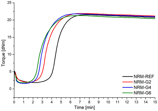The parameters characterizing the kinetics of the vulcanization process of prepared natural rubber mixtures are presented in Table 2 and supported by vulcametric curves presented in Figure 2. The addition of polyurethane glycerolysate in the rubber mixtures did not significantly affect the values of minimum and maximum torque or the difference between them. The difference between minimum and maximum torque is connected with the cross-link density of final vulcanizates, and it can be stated that the highest cross-link density can be obtained for NR-G4. It is also clearly visible that addition of polyurethane glycerolysate results in a decrease in scorch and optimum vulcanization time, while curing rate index decreases at the same time. The observed trend suggests that polyurethane glycerolysate promotes activation of the vulcanization process and acts as a vulcanization retardant. The degree of reversion of the vulcanization process (R300) is around 2% for all prepared materials.