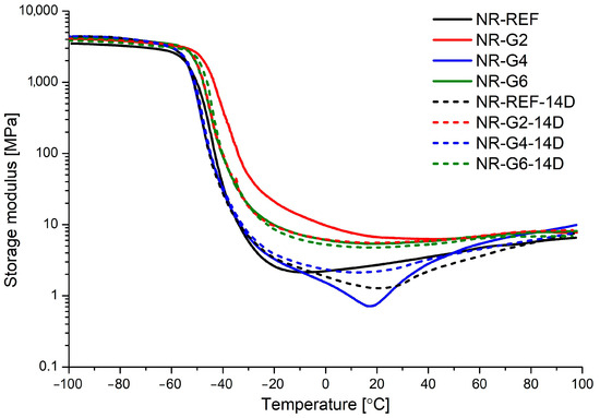 Storage modulus versus temperature for natural rubber vulcanizates non-aged (NR-REF, NR-G2, NR-G4 and NR-G6) and subjected to accelerated thermal aging in air (NR-REF-14D, NR-G2-14D, NR-G4-14D and NR-G6-14D).