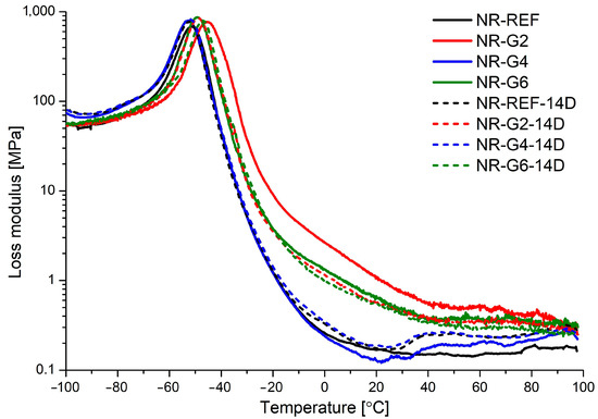 Loss modulus versus temperature for natural rubber vulcanizates non-aged (NR-REF, NR-G2, NR-G4 and NR-G6) and subjected to accelerated thermal aging in air (NR-REF-14D, NR-G2-14D, NR-G4-14D and NR-G6-14D).
