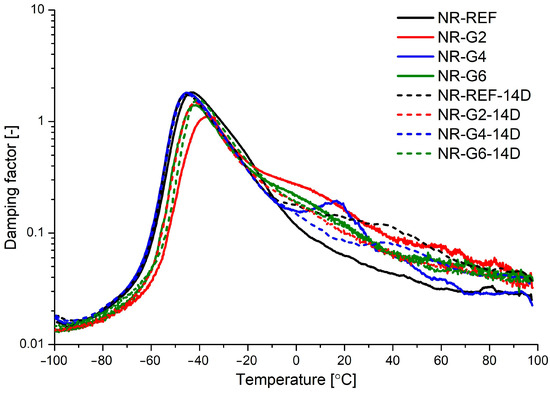 Damping factor versus temperature for natural rubber vulcanizates non-aged (NR-REF, NR-G2, NR-G4 and NR-G6) and subjected to accelerated thermal aging in air (NR-REF-14D, NR-G2-14D, NR-G4-14D and NR-G6-14D).