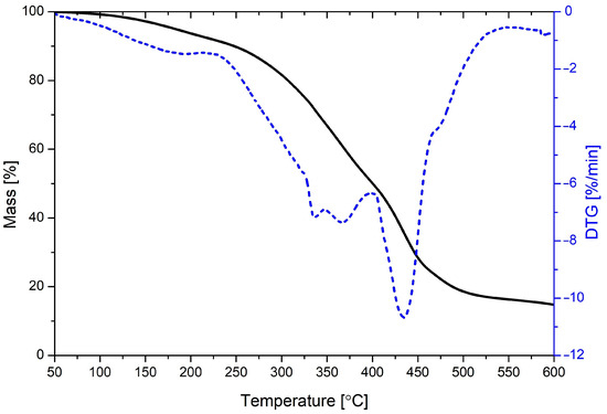 Parameters characterizing the thermal stability of glycerolysate and obtained vulcanizates, i.e., temperatures at which 5 and 10 wt.% mass loss occurs (Td5 and Td10), and the temperature at which mass loss occurs with the highest speed (Td max), are presented in Table 5. The presented parameters are supported by thermogravimetric (TG) and derivative thermogravimetric (DTG) curves. The TG and DTG curve for glycerolysate is presented in Figure 6, while TG and DTG curves for prepared rubber vulcanizates are presented in Figure 7 and Figure 8, respectively.