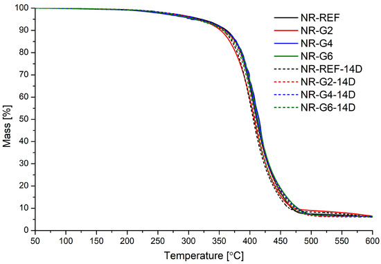TG curves for prepared natural rubber vulcanizates.