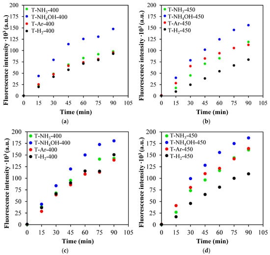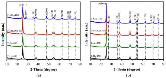 In order to track the absorption ability of the studied samples, UV-Vis/DR spectroscopy measurements were performed. On the basis of the presented spectra (Figure 5a,b) it can be observed that most studied photocatalysts demonstrated a similar absorption in the UV-Vis range. However, it is worth noting that samples modified with ammonia (T-NH3-400 and T-NH3-450) showed some increased absorption in the visible range. Samples heat-treated in a 400 °C and ammonia atmosphere showed increased absorption in the range of around 400–550 nm, whereas the samples heat-treated with 450 °C had increased absorption in the range of 400–650 nm. Enhanced adsorption of visible light by TiO2 modified with gaseous NH3 is a result of the strong adsorption of ammonia species on the TiO2’s surface. In cases of other modifications of TiO2, such as hydrogenation and doping with an ammonia solution, the modified species were doped not only on the surface but also at the interstitial positions of the TiO2 lattice and at the defect sites of TiO2, and therefore, they did not significantly change the optical properties of the TiO2 surface. In addition to the UV-Vis spectra measurements presented, the band gaps were determined using the Kubelka–Munk method. The results are shown in Figure S2 (Supplementary). Two different values were observed: the first one corresponding to the rutile phase (Eg1) was about 3.1 eV, and the second one corresponding to the anatase phase (Eg2) was about 3.2–3.3 eV. No significant changes were observed in the values of the band-gap energies as a result of the heat-treatment in different atmospheres (NH3, H2, or Ar).