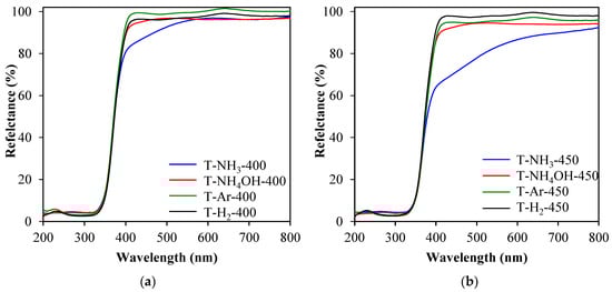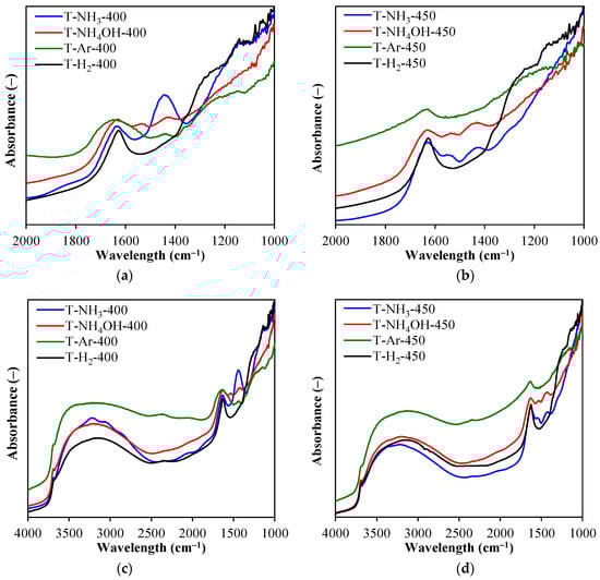 In Figure 4, the FTIR spectra of the obtained TiO2-based photocatalysts are presented. Regardless of the sample, a wide band at the range of around 3800–2500 and a band at 1620 cm–1 were observed due to the presence of physisorbed water and hydroxyl groups coordinated to the TiO2 surface [19]. A wide band at 1240 cm–1 (Figure 4a,b) can be ascribed to the presence of sulphur groups, which originate from the sulphate method of raw TiO2 industrial treatment [3]. Its intensity was therefore significantly lower in cases of samples containing less sulphur (Table 2). In cases of photocatalysts modified with nitrogen-based compounds (T-NH3 and T-NH4OH), two major bands appeared at around 1437 and 1520 cm–1 and can be assigned to NH4+ ammonium ion formed [20] and NH2 groups coordinated to the photocatalyst’s surface [21], respectively. The 1437 cm–1 band intensity was the strongest for T-NH3-400. Interestingly, both T-H2-400 and T-H2-450 had a broad band at around 1250 cm–1, which originated due to the TiO2 hydrogenation and formation of TixHy [22,23].