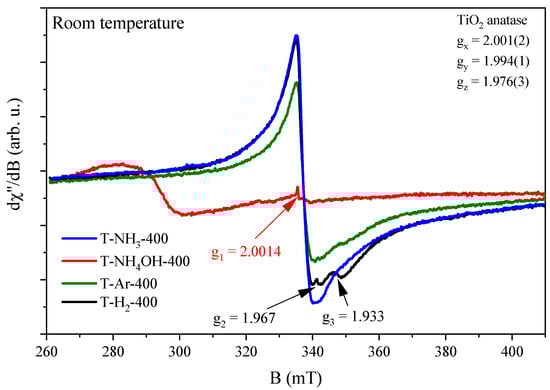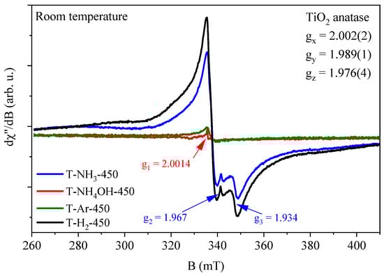 TiO2-based photocatalysts were also obtained at 450 °C and their EPR spectra are presented in Figure 7.