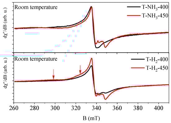Comparison of the intensity and shape of EPR spectra of TiO2-based photocatalysts heat-treated at 400 (black curve) and 450 °C (red curve) in NH3 (top panel) and H2 (bottom panel). The arrows indicate additional, very broad EPR lines.
