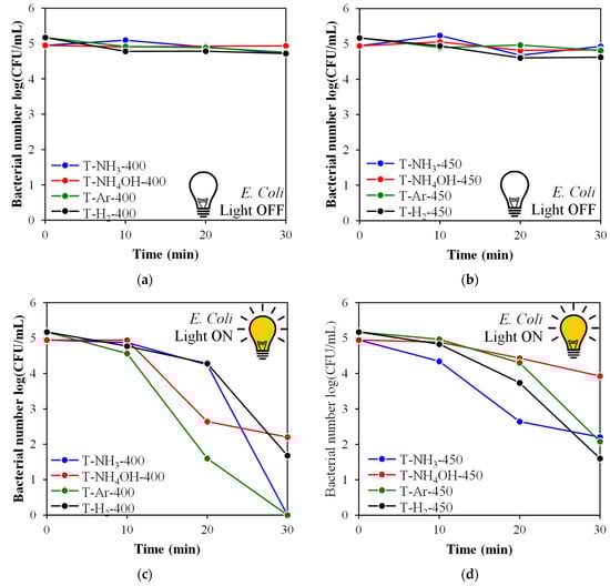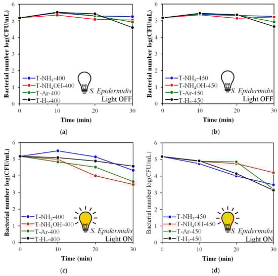 The bactericidal activity of the tested photocatalysts was effective only upon solar irradiation. However, the model of action depended on the type of bacteria. Gram-positive bacteria (S. epidermidis) were more resistant to the photocatalytic process. After 30 min of irradiation, a significant reduction (>2 log) was observed for the T-NH4OH-400, T-H2-450, and T-Ar-450 samples (Figure 9c,d). In the same conditions, total inactivation (>5 log) of the Gram-negative E. coli bacteria was achieved by T-Ar-400 and T-NH3-400 (Figure 10c). A satisfactory outcome of bacterial reduction > 3.5 log) was also obtained for T-H2-400, T-H2-450, T-NH3-450, and T-Ar-450 (Figure 10c,d). The weakest antibacterial property in relation to both tested bacteria was presented by T-NH4OH-450 irradiated under solar light (Figure 9d and Figure 10d).