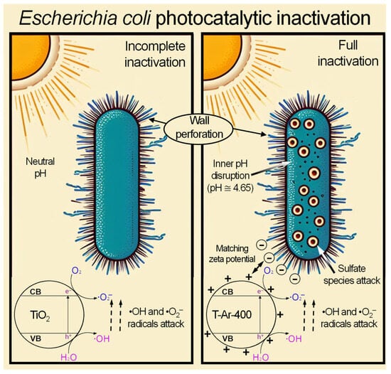 The performed studies showed that sulphated titania is a very attractive feedstock for the production of photocatalysts that have antibacterial properties towards E. coli inactivation. The proposed mechanism of photocatalytic E. coli inactivation is shown in Figure 12. Since sulphur is considered an active element with antibacterial, antifungal, and antiviral properties [25], the sulphur content of the prepared TiO2-based photocatalysts is a significant factor in determining their antibacterial potential for E. coli. It has been demonstrated by a few research teams that S-doped TiO2 exhibited strong antibacterial activity against selected strains [12,26,27]. The photocatalytic activity of the TiO2-based samples obtained in the present study with increased sulphur content, such as T-NH3-400 (1.19%) and T-Ar-400 (1.40%), had increased antimicrobial activity against E. coli under solar irradiation. The remaining sulphuric species in TiO2 after its treatment at relatively low temperatures, such as 400 or 450 °C, revealed antimicrobial properties towards E. coli.