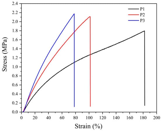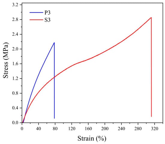 Stress–strain curves for neat NBR vulcanized by 3 phr of dicumyl peroxide (P) or vulcanizing system with 3 phr of sulfur (S), the digit after the codes indicates the concentration in phr.