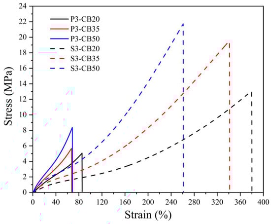 Stress–strain curves for NBR vulcanizates filled with different carbon black (CB) concentrations and cured by 3 phr of dicumyl peroxide (P) or sulfur (S). The digit after the codes indicates the concentration in phr.