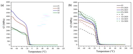 Temperature dependences of the storage modulus for (a) neat NBR vulcanizates cured by dicumyl peroxide (P) or sulfur vulcanizing system (S) and (b) for NBR vulcanizates filled with different carbon black (CB) concentrations and cured by 3 phr of dicumyl peroxide or sulfur. The digit after these codes indicates the concentration in phr.
