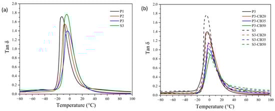 Temperature dependences of Tan δ for (a) neat NBR vulcanizates cured by dicumyl peroxide (P) or sulfur vulcanizing system (S) and (b) for NBR vulcanizates filled with different carbon black (CB) concentrations and cured by 3 phr of dicumyl peroxide or sulfur. The digit after these codes indicates the concentration in phr.