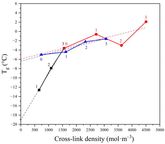 The dependence of glass transition temperature (Tg) on the cross-link density for NBR vulcanized by various amounts of dicumyl peroxide (black, numbers indicate the peroxide concentration in phr) and vulcanized by 3 phr of either peroxide (red) or sulfuric system (blue) filled with varying amounts of carbon blacks (0—0 phr, 1—20 phr, 2—35 phr, and 3—50 phr).