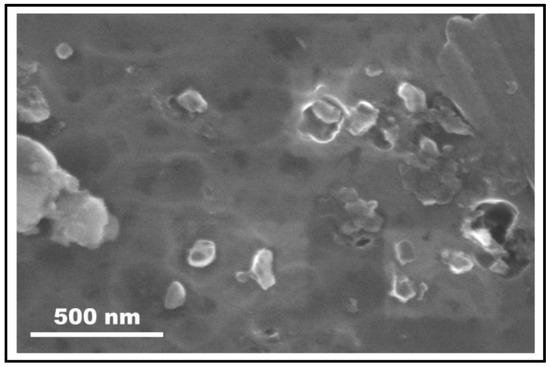 SEM micrograph of FSP-processed aluminum composite showing presence of ceramic particles with sizes less than 200 nm.