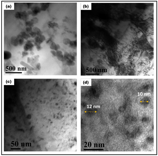 (a): Bright-field TEM micrograph of FSP-processed Al composite; particles are seen in dark contrast, while the matrix is bright contrast. (b): Bright-field TEM micrograph showing dislocation substructure. (c): FSP-processed composite showing fine particles. (d): High-magnification micrograph showing particles in the size range of 10–15 nm.