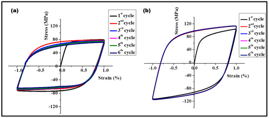 Bauschinger tests (tension followed by compression) for (a) base metal (b) composite at ±1% strain amplitude and strain rate of 10−4 s−1.